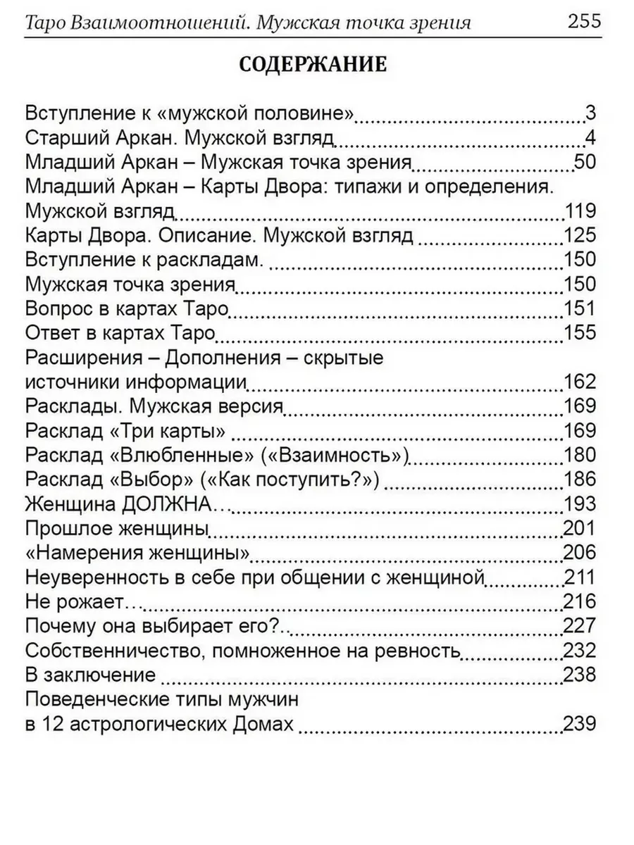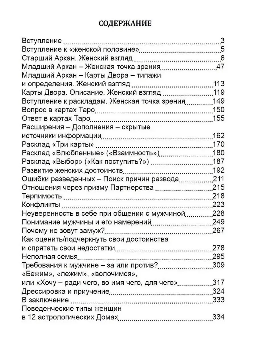 В книге подробно и с примерами разобраны 17 уникальных раскладов: Развитие женских достоинств, Ошибки разведенных - Поиск причин развода, Неуверенность в себе в общении с мужчиной, Понимание мужчины и его намерений, Почему не зовут замуж? Как оценить/подчеркнуть свои достоинства и спрятать свои недостатки, Неполная семья, Требования в мужчине - за или против? - формулы корректного управления, Хочу - ради чего, во имя чего, для чего - три вида мужчин - бежим, лежим, волочимся, Дрессировка и приучение, Женщина ДОЛЖНА. Прошлое женщины, Намерения Женщины, Неуверенность в себе в общении с женщиной, Не рожает Почему выбирает его?.-.. Собственничесвто помноженная на ревность.